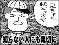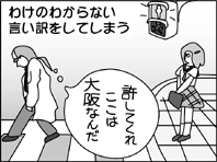 信号の渡り方![]() エイリアンのための大阪の歩き方。今日は信号の渡り方です。大阪独自のルールを知らないと大けがにつながりますのでしっかり読んでください。 まずは車を運転している場合。車には乗らないと言う人も、安全に歩くためには車のことを知っておく必要があります。大阪人は信号を守らないとよく言われますが、そんなことはありません。少しだけ信号に対する感覚が違うだけなのです。 みなさんは正しい信号の意味を知っていますか。「青は進め」「黄色は注意」「赤は止まれ」――そんなふうに理解していたのでは信号無視より危険です。たとえば青は「ほかの交通に注意しながら通行してもよい」。これが正しい意味。黄色は「停止線で安全に止まれない場合に限り、ほかの交通に注意しながら通行してもよい」。赤は「停止しなければならない」。 これが大阪ではどうか。青の意味は全く同じです。「安全を確認したうえで進行してもよい」。黄色は青と全く同じ。赤はタイミングによって異なります。赤になって3秒以内だと「安全を確認したうえで進行してもよい」。4、5秒までは「安全に止まれない場合に限り、注意しながら進行してもよい」。それ以降は「しかたないから止まれ」。さらに青になる3秒前が「ブレーキから足を放せ」。青に変わる瞬間は「ダッシュかませ」です。 わかりましたか。では歩行者の歩き方です。こちらはシンプル。「車が来てなければ渡れ」「車が来てたら渡るな」これだけですから。信号の色はあまり関係ないようです。ただ、車はいつどこから現れるかわかりません。左折・右折してくる車、Uターンやバックしてくる車――あらゆる場合を考慮した上で安全な場合だけ渡ってよい、ということなんです。たとえ、信号が青でも、ですよ。自分の身は自分で守るよう心がけてください。 [1998年12月4日] |