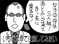 電車の乗り方![]() 今日はエイリアンのための大阪の歩き方、電車編。大阪独自のルールをしっかりと身につけましょう。 まずは切符の買い方。券売機の上の料金表を10m手前から確認しながら接近し、5m手前で財布を出します。券売機の前に来たときには必要な小銭を手に握っていること。切符とおつりが出てきたら、後ろの人がすでに小銭を入れようと身構えてますから、さっと逃げるようにホームへ向かいます。 自動改札では、入れた切符が出てきたらすぐに取れるよう歩調を機械に合わせます。ホームへの階段では、降りる人が全面を占領してドドドと向かって来て、通してもらえないこともしばしばです。「左側通行なのに」と文句を言ってもムダ。日ごろからアメフトなどのスポーツに親しみ、敵を次々にかわしていくしかありません。 ホームでは2列で電車を待ちますが、スキマを開けると「並んでないねんな」と割り込まれます。ぎっちり詰めて並びましょう。さあ電車が来ました。降りる人のためにドアの前を開け、1列ずつに分かれます。この時もたもたして前の人との間が少しでも開くと、またまた横から入られます。一瞬の油断で後ろの人に大迷惑をかけます。 さあ、二手に分かれました。最大のヤマ場はここからです。もしも降りる人がまだいるうちに反対側の列が先に入り始めたらどうします? 「降りる人が済んでから!」。そう叫んで乗り始めた列を引き留める。いい方法ですが、実行は無理ですね。ならば次善の策は? そう、あなたもすかさず乗り込むのです。いやでしょうが、降りる人の迷惑よりも後ろに並んでいる人の迷惑を考えましょう。だってこれから車内で顔つきあわせるんだし。 これでやっと乗車できました。こうなったらもう早い者勝ちです。ダッシュするなり、仲間と声をかけあいながら席を取るなり、好きにして下さい。 [1998年11月27日] |